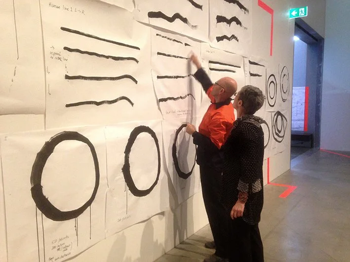 Engaging humans and robots in friendly competition, this exhibition sought ways to pose questions to one another and expose what both can do well and what both can do better. One might imagine that humans excel at process adjustment, such as variation of touch relative to action already in-process and variation to another agent or material qualities. One might imagine a robot to have better precision and consistency in terms of the execution of lines in 2D and 3D space and the accurate repetition of those lines.